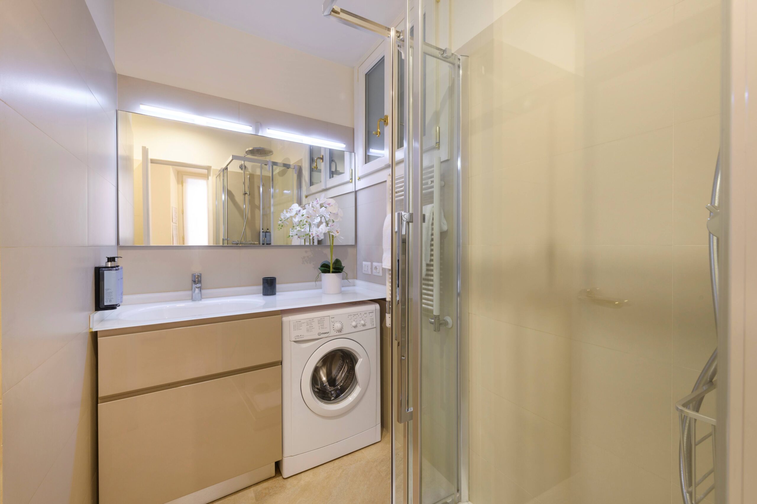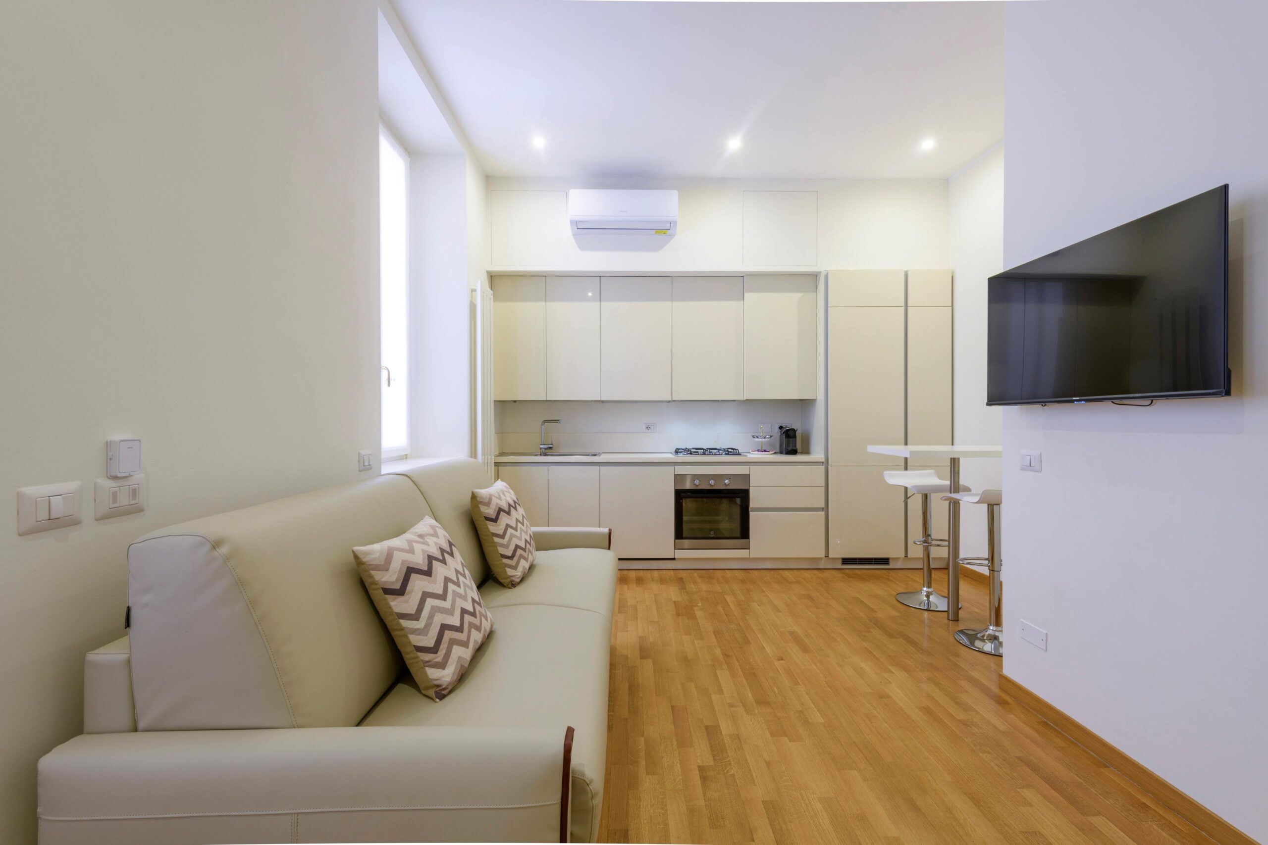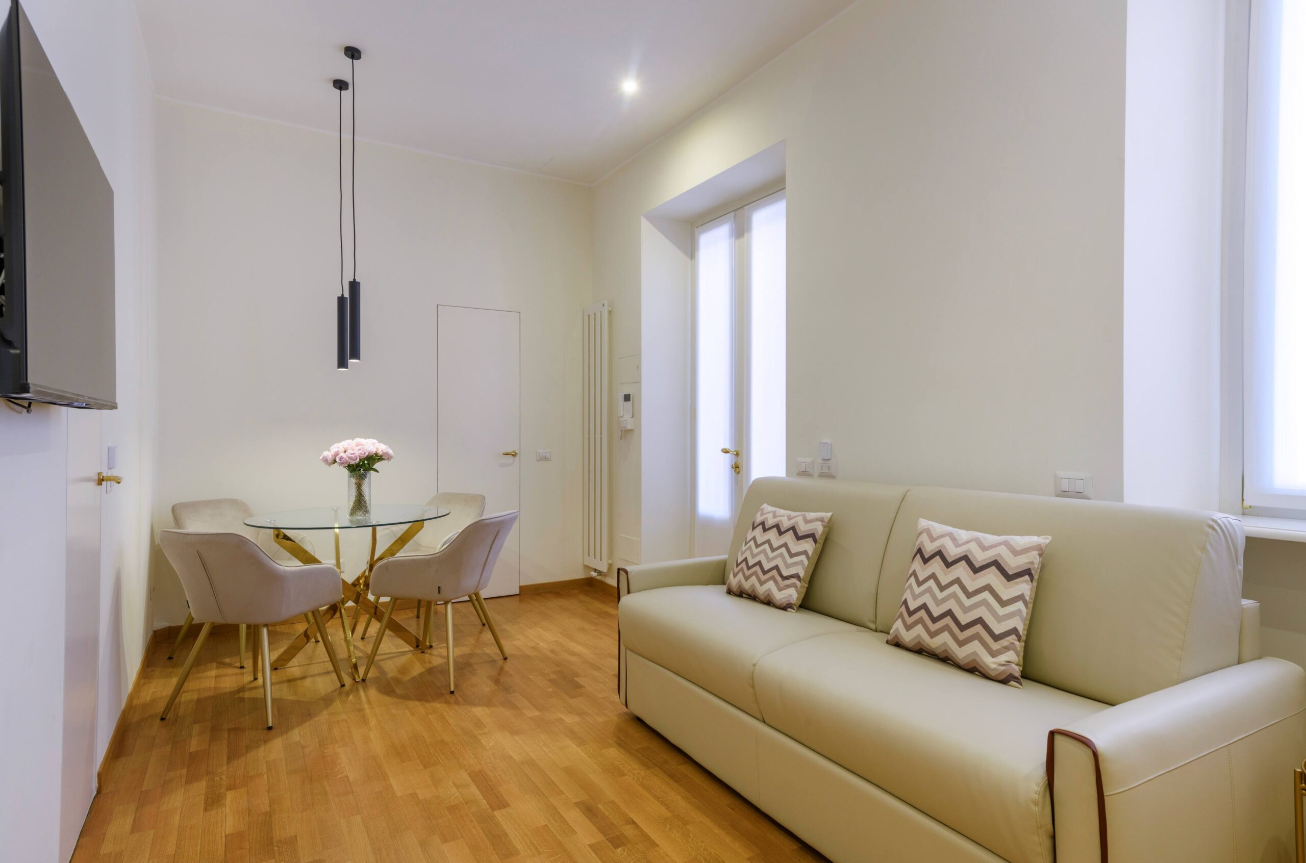 Moderno appartamento di 50 mq con balcone al terzo piano di un elegante palazzo situato a pochi passi dal Castello Sforzesco e dal quartiere di Brera, composto da ampio soggiorno con cucina attrezzata e comodo divano letto, camera matrimoniale e bagno con doccia, ideale per un soggiorno confortevole e funzionale.